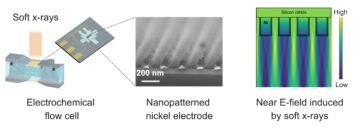 To demonstrate the approach, the researchers collaborated with the Molecular Foundry and Center for X-Ray Optics (CXRO) to fabricate nickel electrodes patterned with an array of nanoscale structures, choosing nickel because it is both stable during lithography and a well-studied electrochemical model system. Using resonant soft x-ray scattering (RSoXS) at Beamline 11.0.1.2, the team studied the oxygen evolution reaction at the electrode–electrolyte interface, demonstrating that the periodic nanostructures produced coherent scattering—similar to the diffraction from repeating crystal lattices in protein crystallography—causing the diffraction intensity to scale with the square of the number of repeating units.